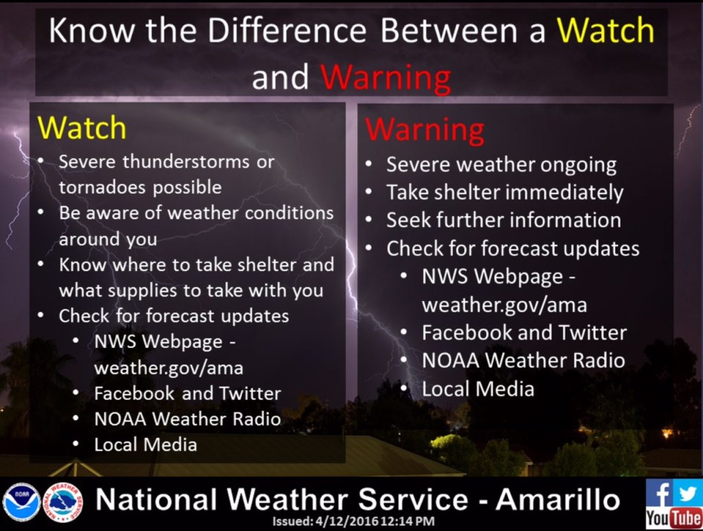 When severe weather is anticipated, a Severe Thunderstorm or Tornado Watch will be issued. It’s very important to know the difference between a Watch and a Warning.