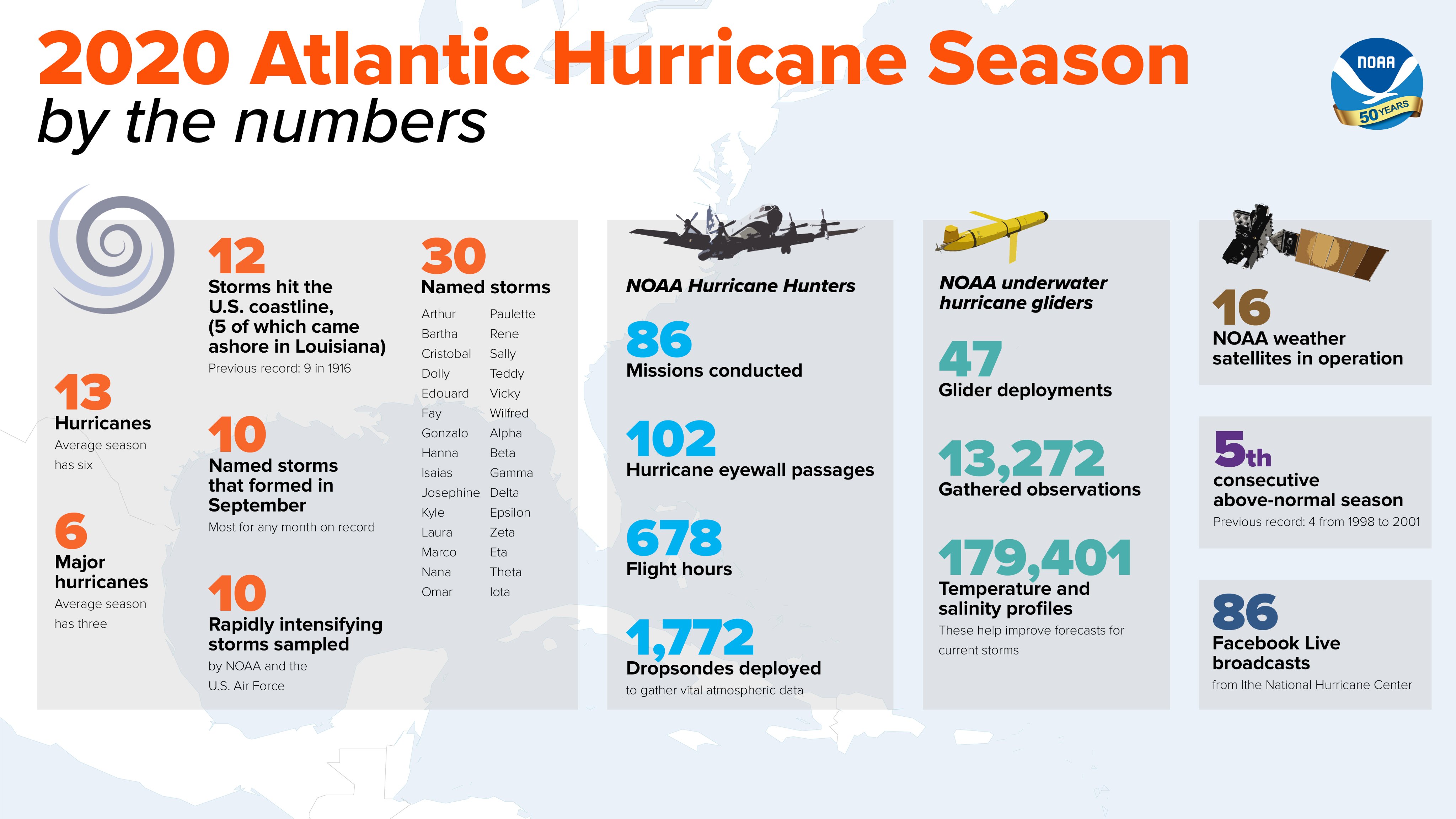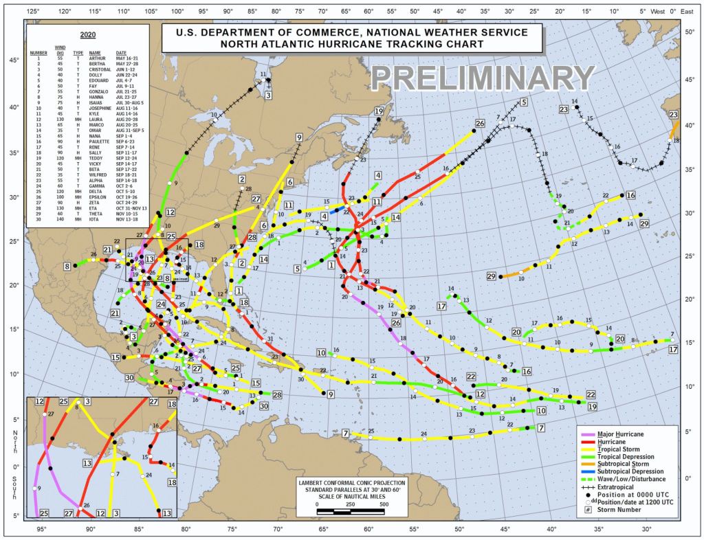 - Last but not least, let’s take a look back at the 2020 Atlantic hurricane season by the numbers and a review of the events on a map of the Atlantic basin. By all respects, it was a remarkable year that won’t soon be forgotten. More details from NOAA: “Record-breaking Atlantic hurricane season draws to an end.“