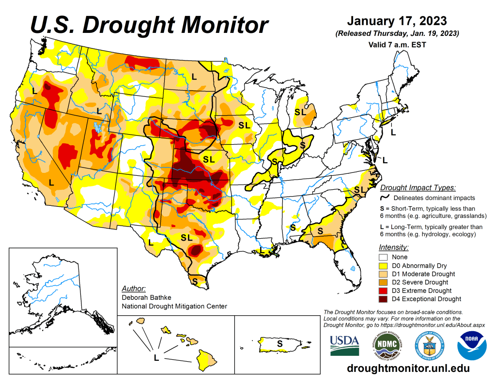- Here is the latest update on the USA Drought Monitor. Recent precipitation has brought some improvements even to California in the wake of several significant storm systems. East of the Mississippi river, conditions have improved significantly while parts of the central and southern plains still have extreme or exceptional drought conditions.