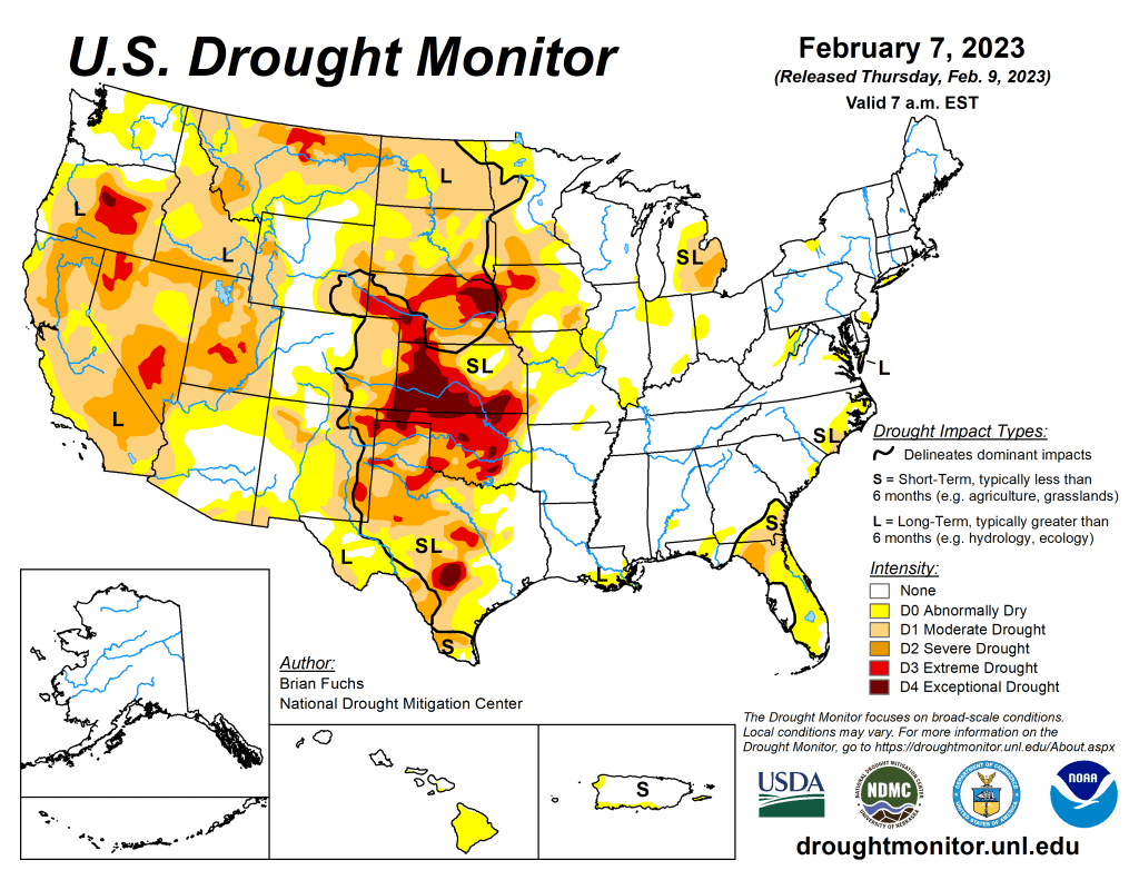 - Here is the latest update on the USA Drought Monitor. Conditions east of the Mississippi river have improved significantly while parts of the central and southern plains still have extreme or exceptional drought conditions in spite of recent snow, sleet, and rainfall.