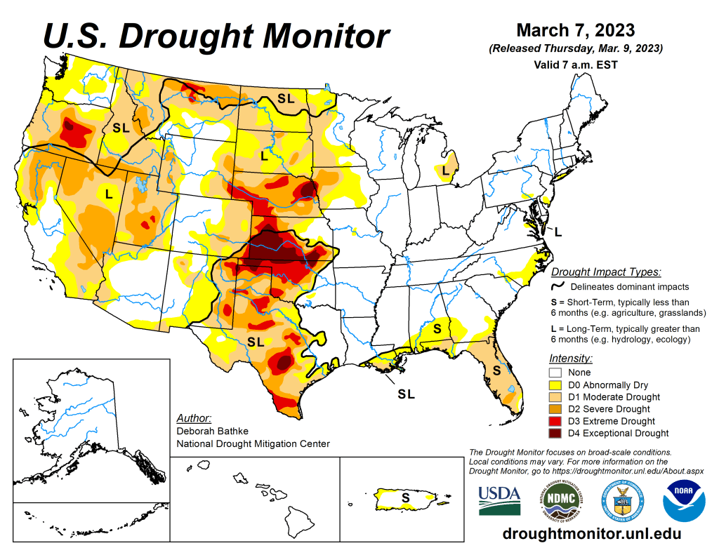 - Here is this week’s update on the USA Drought Monitor. Conditions east of the Mississippi river continue to improve. Extreme or exceptional drought conditions exist for much of the plains states. Minor improvements have shown up this week in the west although dry conditions persist in many areas.