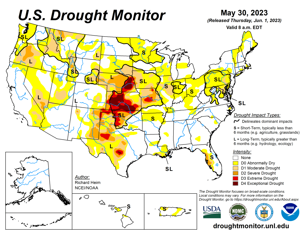 - Here is this weeks update on the USA Drought Monitor. Conditions east of the Mississippi river have improved a great deal. Extreme or exceptional drought conditions continue for a few central and southern plains states. Recent thunderstorms have helped ease drought conditions across Kansas, Nebraska, Oklahoma, and Texas.
