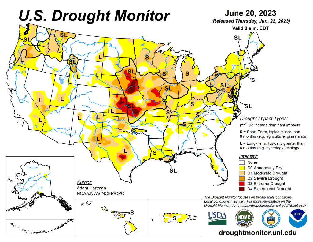 - Here is this weeks update on the USA Drought Monitor. Conditions east of the Mississippi river have improved a great deal. Extreme or exceptional drought conditions continue for a few central and southern plains states. Recent thunderstorms have helped ease drought conditions across Kansas, Nebraska, Oklahoma, and Texas.