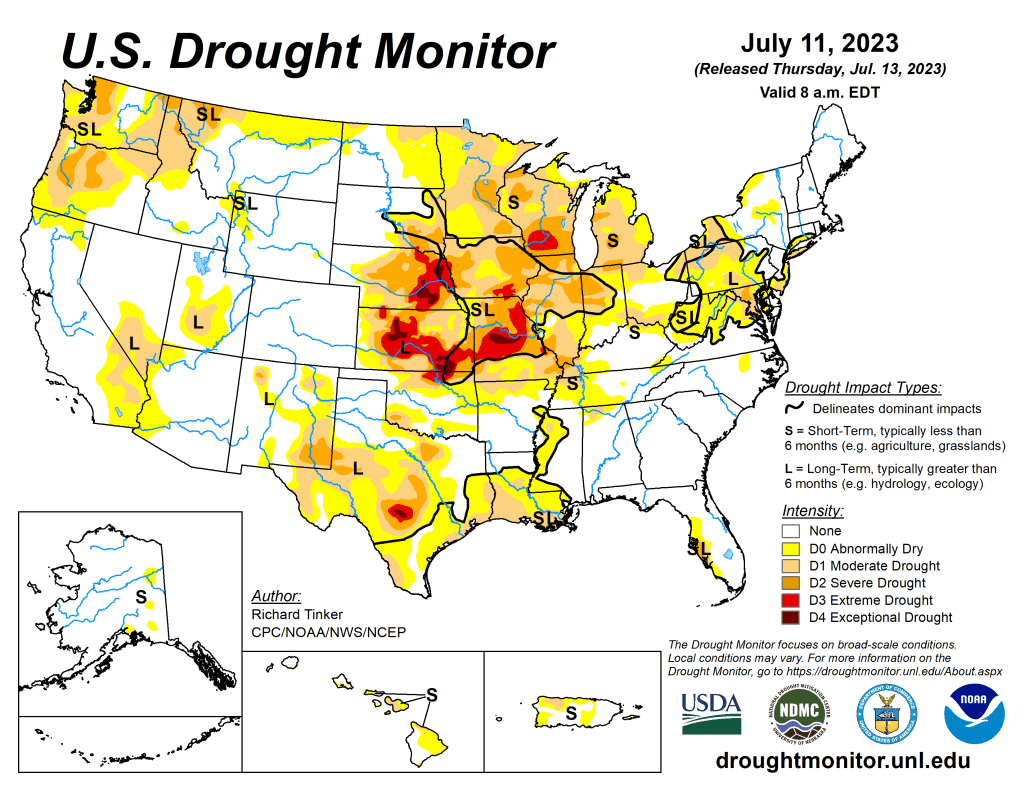 - Here is this weeks update on the USA Drought Monitor. Conditions east of the Mississippi river have improved a great deal. Extreme or exceptional drought conditions continue for several areas in the midwest and central plains.