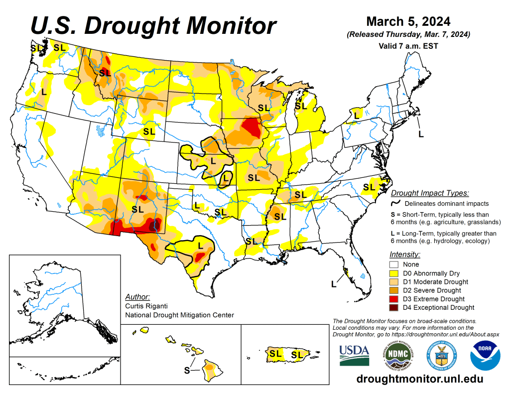 - Here’s the latest update on the US Drought Monitor. Many regions have seen an increase in drought conditions of many intensities. The latest fire weather outlooks can be found at the Storm Prediction Center website where they are updated daily.