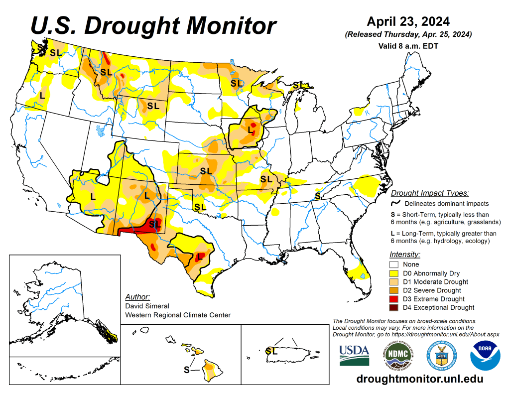 Greetings everyone. Thanks so much for stopping by. Today, April 27, 2024, will be an active severe weather day across much of the US great plains with Kansas, Oklahoma, and Texas forecast to get the greatest number of severe weather reports, including tornadoes. Therefore, our overview of severe weather preparedness will stay with a review of tornado safety. Along with other interesting science reads we have the latest US Drought Monitor update. Let’s get started.