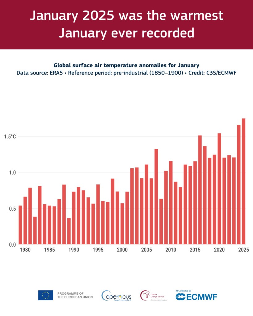 - The latest climate data shows that January 2025 was a very warm month around the globe and also had the lowest amount of Arctic sea ice.