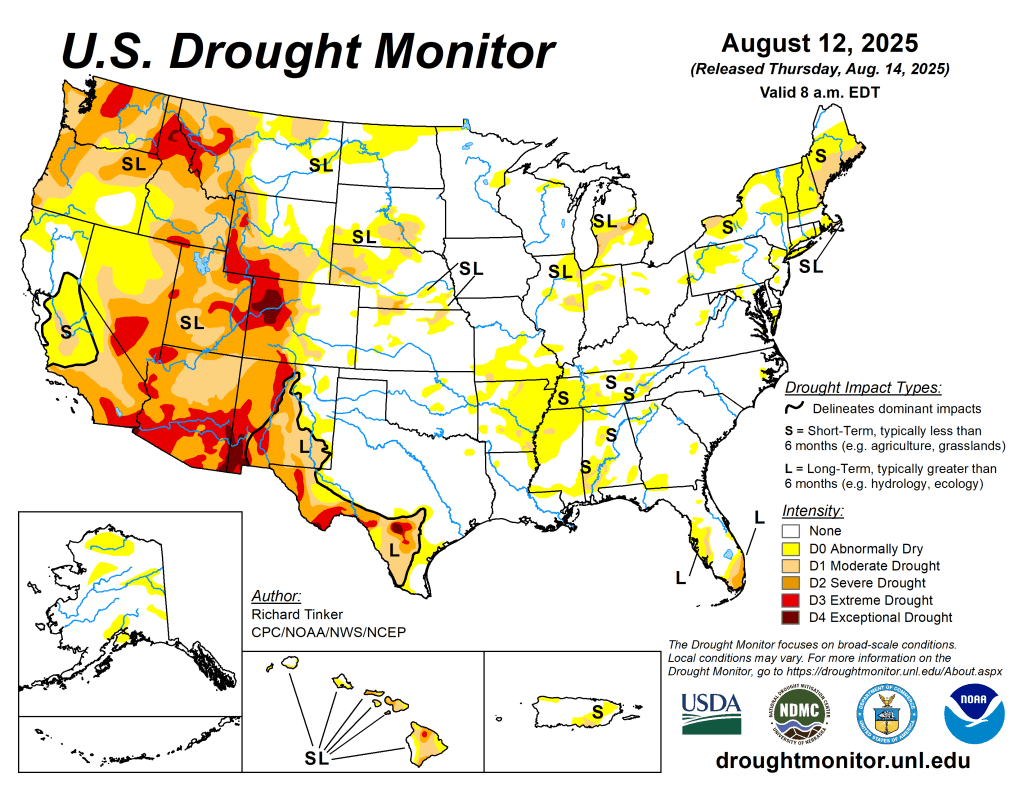 Here’s the latest update on the US Drought Monitor. The USA saw significant shifts in drought conditions last week, with improvements in some regions due to heavy rain, while others experienced worsening drought from heat and dryness. The latest fire weather outlooks can be found at the Storm Prediction Center website where they are updated daily.