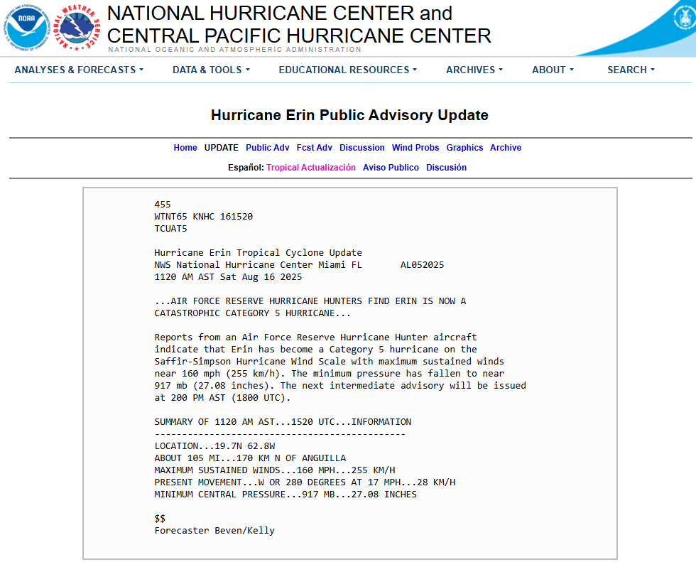 - UPDATE: As of this post, Hurricane Erin has gone through rapid intensification and is now a very dangerous Category 5 hurricane. For the latest official updates, monitor NOAA’s National Hurricane Center.