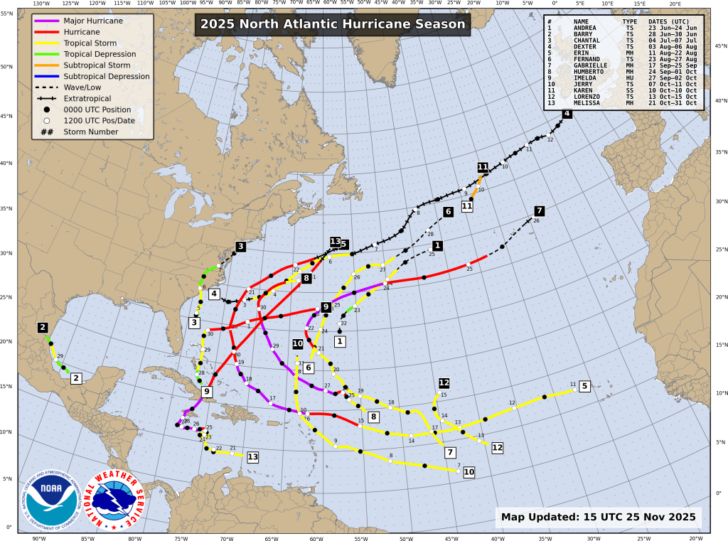 - The 2025 Atlantic hurricane season officially ends on November 30. It was a season marked by unprecedented AI‑enhanced forecasts, three record‑tying Category 5 storms, and a rare U.S. hurricane lull. All of these showcased dramatic swings from tranquil stretches to fierce, powerful storms. Let’s take a look back at a remarkable year.